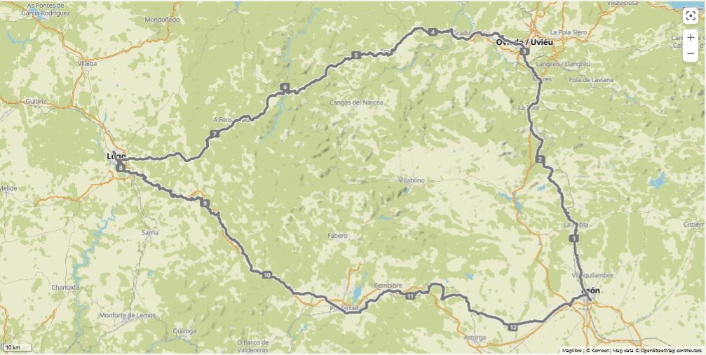 El Kamino está formado por los tramos pertenecientes al Camino de San Salvador y al Primitivo, pertenecientes a la ruta del Camino de Santiago. Uniendo León con Oviedo hasta Lugo, donde tomaremos la ruta alternativa del monje Kunig, evitando la parte más dura pero no menos espectacular del Monte O’Cebreiro, para dar la vuelta hasta las Herrerías, donde enlazamos con el camino francés inverso hasta Ponferrada. En donde, de nuevo, nos desviaremos por la ruta del monje Kunig rodeando el monte Irago hasta León. Realizando, así, una ruta circular para prolongar la aventura sin depender de otros medios de transporte.