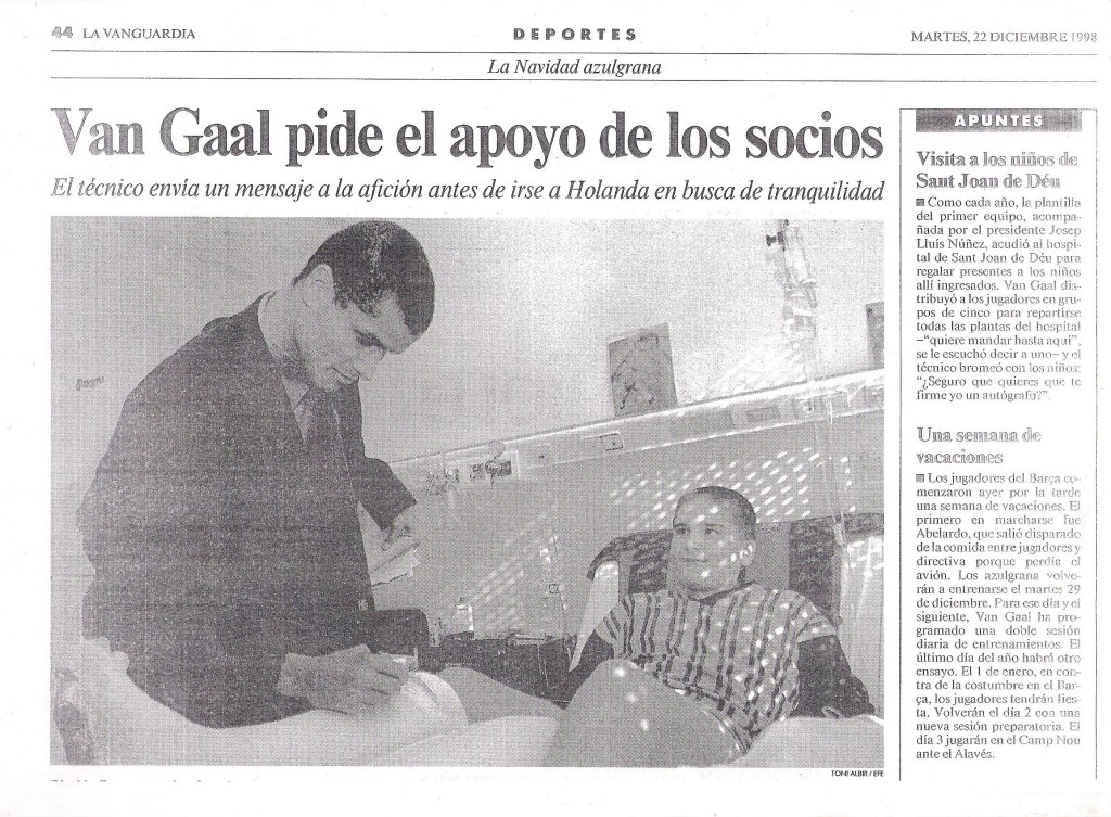 El caso es que, después de varias operaciones y escayolas, antes de cumplir el año y la última cuando cumplí los 14 años, al menos el universo me regaló la oportunidad de conocer en personas a algunas de las figuras de mi equipo de fútbol favorito, el FC Barcelona, en una de sus visitas navideñas a los niños limitados parcial o totalmente del hospital de San Juan de Dios.