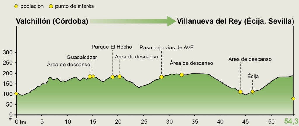 El trayecto es un ruta de 160Km, mayoritariamente llano con tendencia a desnivel negativo respecto el nivel del mar, un 80% por pista con terreno regular de tierra señalizado oficialmente por la red de Caminos Naturales y Vías Verdes del Ferrocarril conocida como Vía verde de la Campiña, entre Córdoba y Marchena (Sevilla).